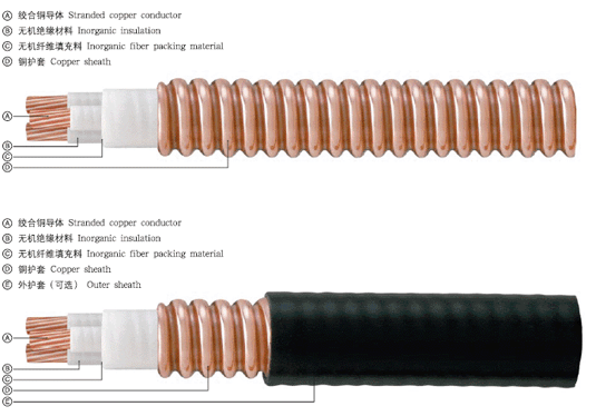 、巽~導體②耐高溫(1375℃)不會(huì )燃燒的無(wú)機(礦物)絕緣帶絕緣③外銅套