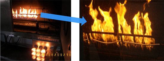 PVC電線(xiàn)已起火燃燒,并冒出大量濃煙;沃爾輻照交聯(lián)電線(xiàn)(富社電線(xiàn))卻完好無(wú)損。