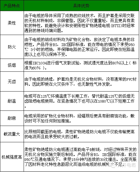 柔性礦物絕緣電纜(BBTRZ)是由銅絞線(xiàn)、礦物化合物絕緣、陶瓷化防火隔氧層和礦物化合物護套所構成。其采用柔性結構,主要材料均采用無(wú)機材料,彌補了結構硬、易燃燒、有毒等缺陷,它還具有一些其他電纜所不可能具有的優(yōu)點(diǎn),如:耐火、載流量大、耐沖擊電壓、耐機械損傷、無(wú)鹵無(wú)毒、防爆、防水、耐腐蝕、壽命長(cháng)、安全、耐過(guò)載、耐高溫、成本低等特點(diǎn)。